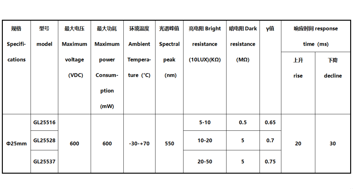 GL25528:亮电阻Light Resistance at 10Lux(KΩ) 10-20