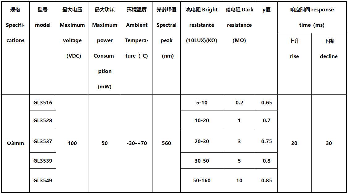 GL3516:Light Resistance at 10Lux(KΩ) 5-10