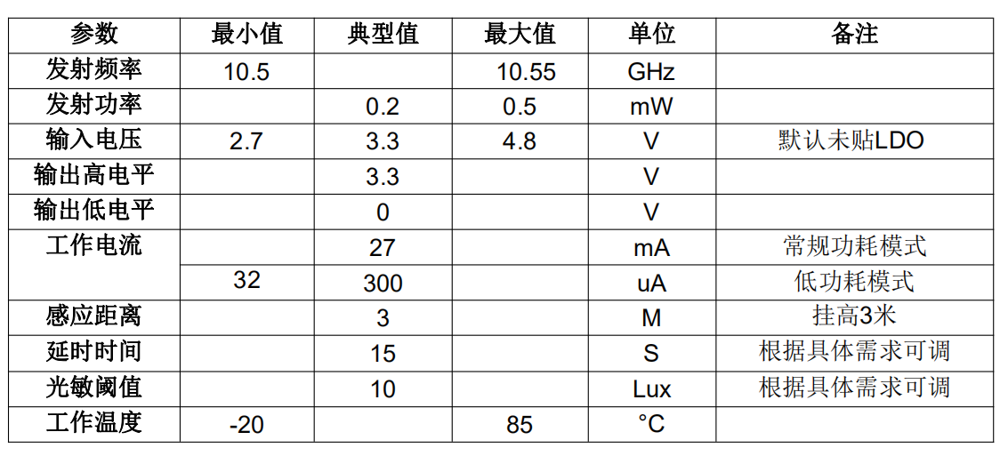 10.525G 功耗,模式可配置的雷达传感器,常规功耗27mA左右,低功耗模式下功耗最低可到55uA左右,模块尺寸16mm*16mm,传感器采用雷达感应芯片AT10LP1T1RDB。该传感器因其功耗低、性价比超高、能轻松通过RF 认证等原因,可广泛应用于电池灯具照明、摄像头唤醒等领域。