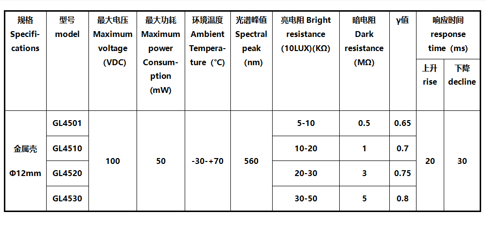 GL4501:亮电阻Light Resistance at 10Lux(KΩ) 5-10