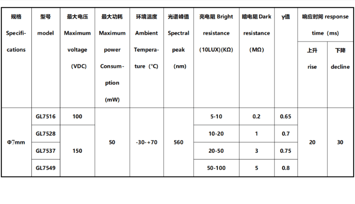 GL7501:Light Resistance at 10Lux(KΩ) 5-10